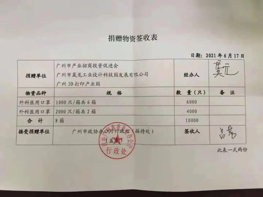 今年5月下旬,广州市荔湾区芳村片区遭受新冠疫情影响,6月3日,荔湾区东沙街道列入封控管理区域。园区积极响应政府关于疫情防控决策部署的号召,分别为广州市政协办、荔湾区工商联、荔湾区冲口街道办事处、荔湾区海龙街道办事处捐赠了外科医用口罩共计120000个及防护面罩1000个。另捐赠广州市华侨文化发展基金会人民币2万元。为广州市及荔湾区抗疫一线工作人员提供微薄之力。