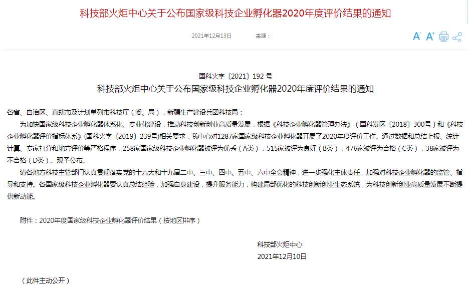 三度蝉联 | 祝贺园区荣获2020年度国家级科技企业孵化器评价A级!