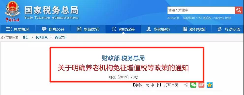 政策依据:《关于明确养老机构免征增值税等政策的通知》(财税〔2019〕20号)