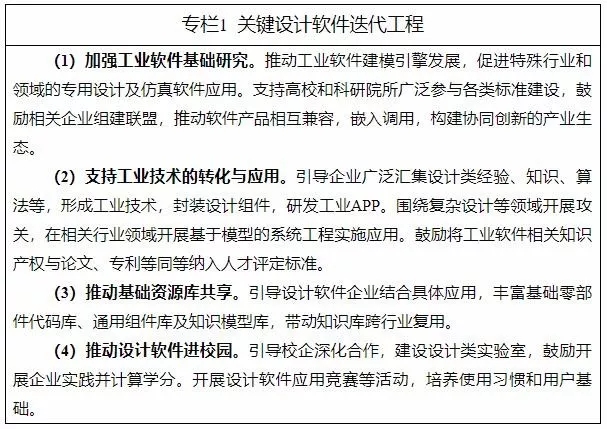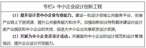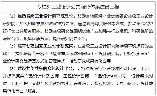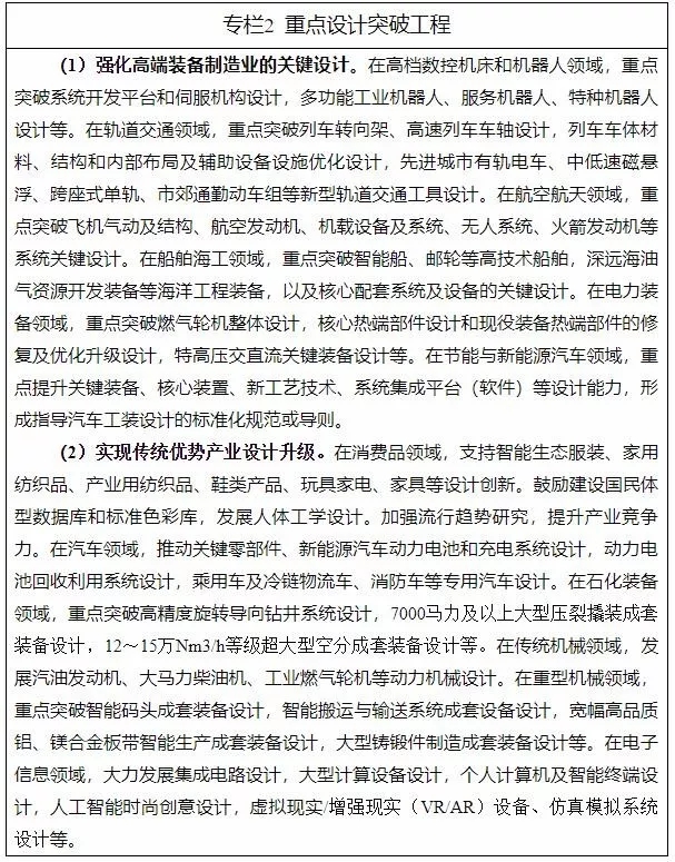 针对制造业短板领域设计问题和影响设计创新发展的突出问题,提出5大任务、13项举措。一是夯实制造业设计基础。提出要加大基础研究力度,开发先进适用的设计软件;二是推动重点领域设计突破。提出要补齐装备制造设计短板,提升传统优势行业设计水平,大力推进系统设计和生态设计;三是培育高端制造业设计人才。提出要改革制造业设计人才培养模式,畅通设计师人才发展通道;四是培育壮大设计主体。提出要加快培育工业设计骨干力量,促进设计类中小企业专业化发展;五是构建工业设计公共服务网络。提出要健全工业设计研究服务体系,搭建共创共享的设计协同平台,强化设计知识产权保护,营造有利于设计发展的社会氛围。围绕各项任务,《行动计划》通过专栏的方式提出了关键设计软件迭代、重点设计突破、制造业设计人才培育、中小企业设计创新、工业设计公共服务体系建设、工业设计知识产权保护维权等6项工程,明确具体要求,增加行动计划的可操作性。