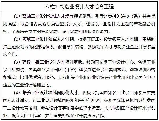 (六)改革制造业设计人才培养模式。研发体现中国特色、融汇国际标准、对接市场需求、横跨学科门类的设计类专业课程,构建多学科交叉融合的设计高等教育体系。结合“新工科”建设,推广CDIO(构思-设计-实现-运作)工程教育模式。聚焦制造业培养交叉型、复合型设计人才,大力培育精益求精的工匠精神。鼓励社会团体、高等院校、科研机构和制造业企业协作办学,探索开放式、网络化的设计教学模式,引导更多社会资源投向设计教育领域。鼓励开展中小学设计思维和创新意识启蒙教育。