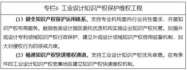 (十二)强化设计知识产权保护。发挥国家知识产权运营公共服务平台作用,鼓励有条件的地区和园区探索建立知识产权快速维权机制和知识产权成果转化平台。加大惩戒力度,严厉打击外观设计专利侵权等违法行为,维护行业竞争秩序。加强设计类评奖、大赛、展览的知识产权保护。顺应设计产业发展实际,探索新业态、新领域的外观设计保护,适当扩大外观设计专利权保护客体的范围。