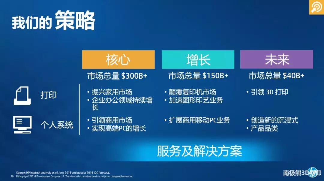 而惠普选择将3D打印作为未来战略的重要组成,Stephen解释说:“惠普有三类核心业务,第一包括PC、主流的打印机等,这些是我们的主流生意;第二是增长性业务,比如前一段推出的A3数码智能复合机的业务;第三是我们未来的业务,惠普定位是未来五到十年的增长空间,3D打印是未来业务非常重要的组成部分。”