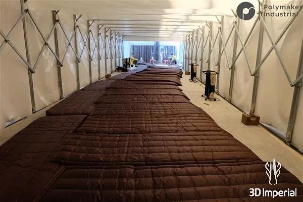 塑料含有12.5%重量的玻璃纤维,增加了强度,并且还减少了困扰大型3D打印的翘曲效果。大尺寸的3D打印与保温和均匀加热有关,这对于打印/打印机来说变得越来越棘手。在这种情况下,建造室长24米,宽4米,高1.5米(计划扩建至3米高),对144立方米的建造室进行保温,这是通过与龙门架一起移动的大型波纹帐篷实现的。将帐篷加热至38°C,并在打印品顶部放置橡皮布以减缓冷却过程,使聚合物链松弛而不会翘曲;橡皮布还可以保护打印品免受灰尘影响。是的,构建室非常大,技术人员在3D打印机内部工作,同时用于监视打印。