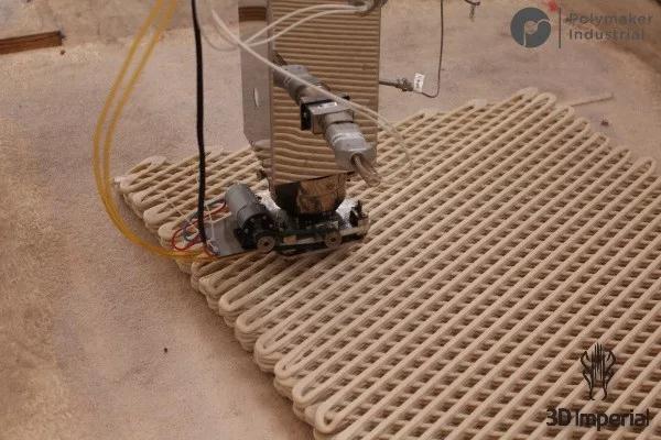 ·喷嘴直径5mm,每小时挤出8kg塑料,精度0.1mm,一边打印一边夯实;