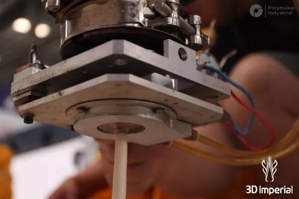 随着打印尺寸的加大,每层的打印时间需要一个小时,这就带来了另外一个问题,在挤出机开始打印下一层时,前一层已经显著冷却。材料的粘合性降低, 橡皮布和玻璃纤维有助于减缓这种冷却,但是他们在打印头在这里做了很多工作,用四根600°C的热风枪重新加热打印层,气枪确保在挤出机工作的地方总是很热,以获得最大的层粘附力。