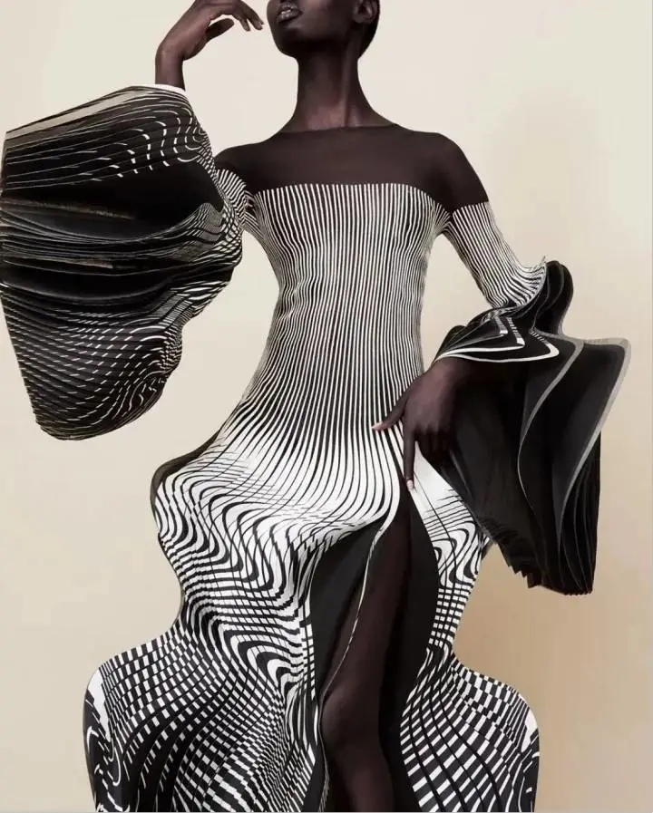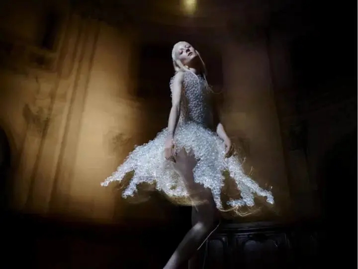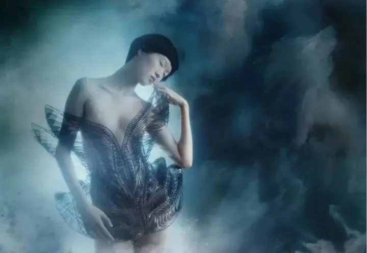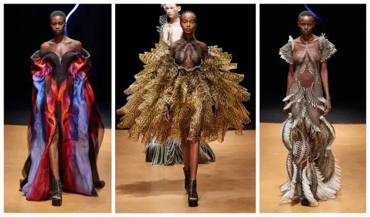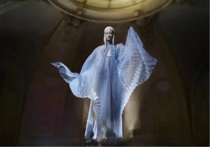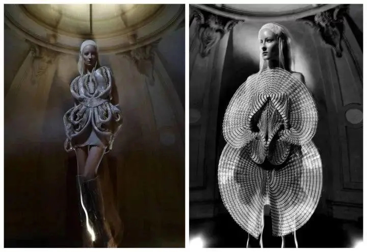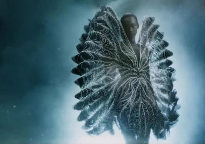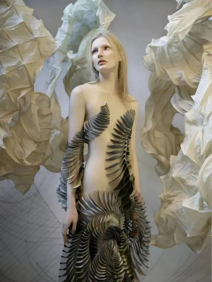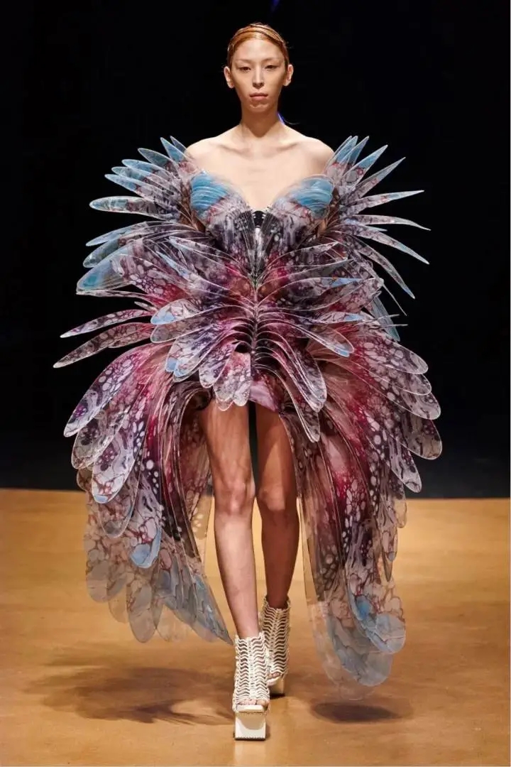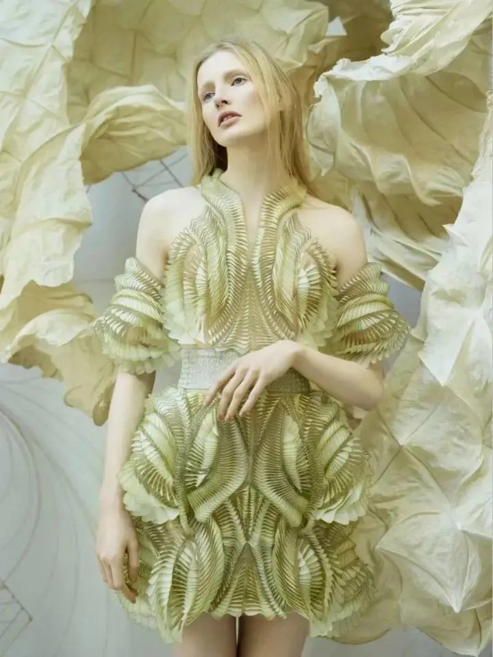 对时尚感兴趣应该与Iris van Herpen学习舞蹈的经历有关。在舞蹈中,Iris van Herpen开始对身体及其空间的关系产生了兴趣,它们在变化与力量的层面上有很多相似的地方。擅长使用3D打印技术及生物材质的设计师Iris van Herpen,以传统手工艺与新型工业技术相结合的方式探寻并拓展时装设计的边界。她手下的设计科技化、未来感十足。