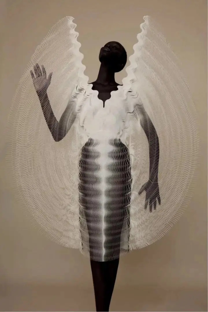Iris :“3D打印保留了传统手工编织的复杂和细节,更实现了我长久以来的一个梦想--用真正“三维”的方式进行创作。这不像以前,先在三维的环境中构思,把它画成二维的手稿,再让它穿在三维的人体上。尽管3D打印机还在尺寸、灵活性上有许多限制,但和我合作的公司正在研发更灵活的3D打印机,去缩短高级定制和成衣之间的沟壑。”
