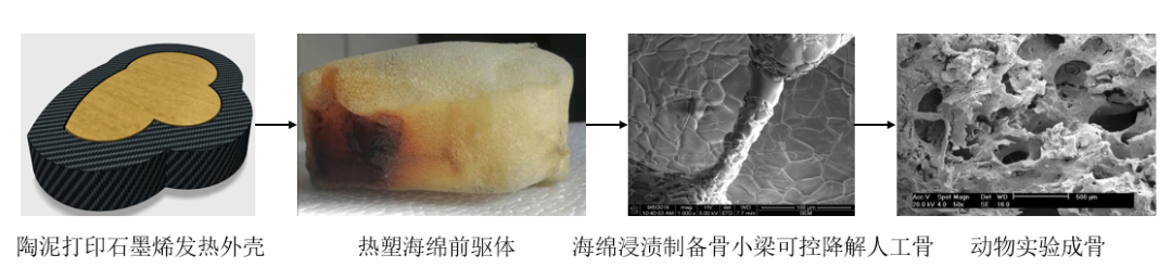 风烯科技法人于显著表示:“这种工艺主要利用一种可打印的石墨烯发热陶泥,打印基于骨创伤形状外模具,然后加热内部聚氨酯前驱体,使海绵具备骨创伤结构,然后通过泡沫浸渍工艺烧掉海绵,获得人体松质骨类似的骨小梁结构可控降解磷酸钙固溶体人工骨。”