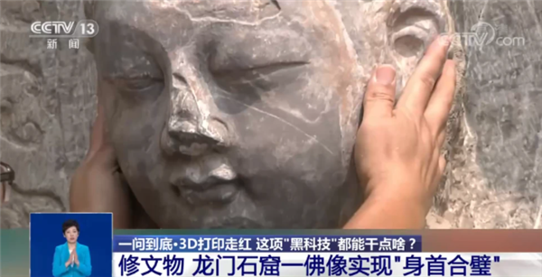 2021年5月11日,据获悉,近日龙门石窟再次引起央视的关注和报道,运用数字化3D打印技术,洛阳龙门石窟奉先寺一尊流散百年的无量寿佛佛首终于在去年实现“身首合璧”!其实,“无量寿佛”身首合璧发生于2020年9月23日,在龙门石窟奉先寺东北角的佛龛前,龙门石窟研究院的研究员杨超杰、副研究员焦建辉携手将3D打印的佛首放置在残缺的佛身上,这尊身首异处近百年的无量寿佛实现身首合一!