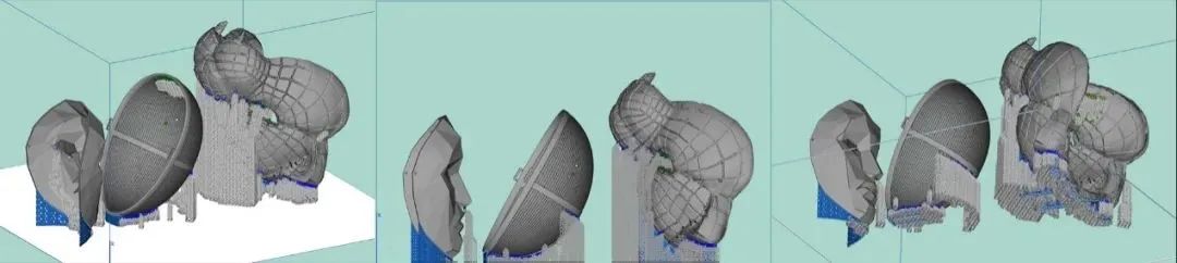 其次对比面具1和2。从直感上判断,面具2是不适合光固化成型技术的,因为大部分的面都是由网格构成,所以表面上都是一个一个的孔。那在光固化成型技术的错觉里,有孔就意味着需要加支撑去实现打印,所以每个孔都会有支撑,这样会给后处理增加很高的难度。但观察数据模拟和打印出来的面具后会发现孔里面是没有支撑的,这是由于打印角度高于30度的情况下光固化成型技术可以实现无支撑打印。而且由于面具是网格构成的,面具2需要后处理的面积是远低于面具1的,所以面具2反而比面具1更适合光固化成型技术。这里就得出来第三个应用范围:打印角度高于30度,光固化成型技术可以实现无支撑打印。结合面具2和面具3的经验就可以得出面具1也同样适合光固化成型技术的,因为表面需要光滑,并且眼睛部位的孔角度高于30度。