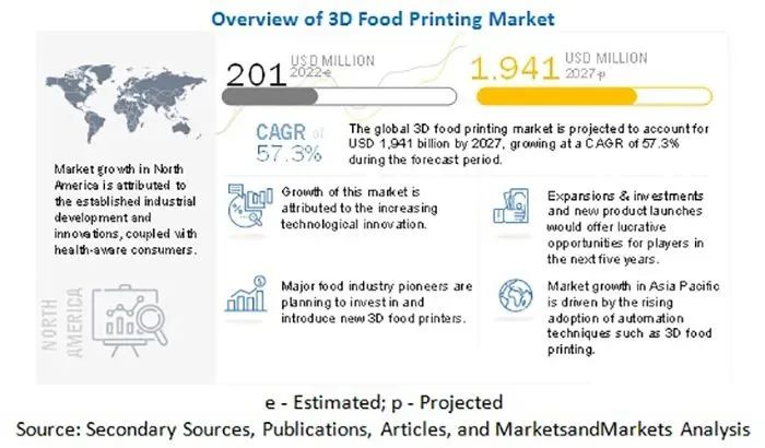据获悉,全球市场研究机构MarketsandMarkets发布了一份研究报告,预测食品3D打印市场在2022年将达近2.01亿美元,预计到2027年将达到近19.41亿美元,复合年增长率为 57.3%。